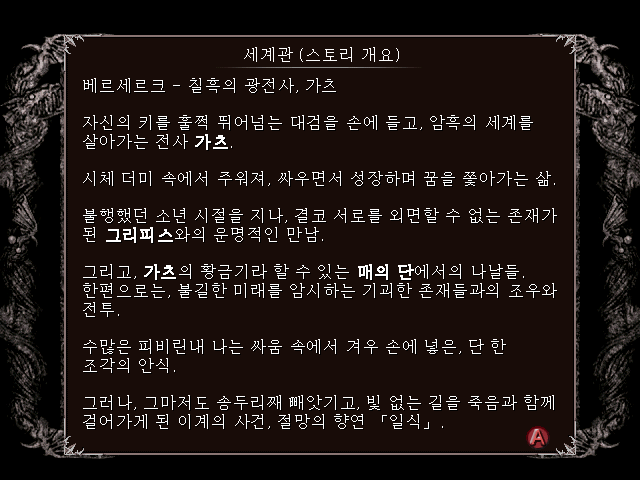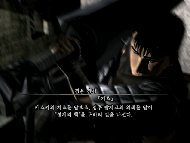 "베르세르크" 중 첫 콘솔 게임으로 원작 특유의 암울하고 답도 없는 처절한 분위기를 매우 잘 살렸다고 평가받는 게임입니다. 액션 명가라는 프로레슬링 게임 명가 유크스에서 만들어서 그런지 액션과 게임이라는 재미에는 충실하다 할 수 있겠네요.